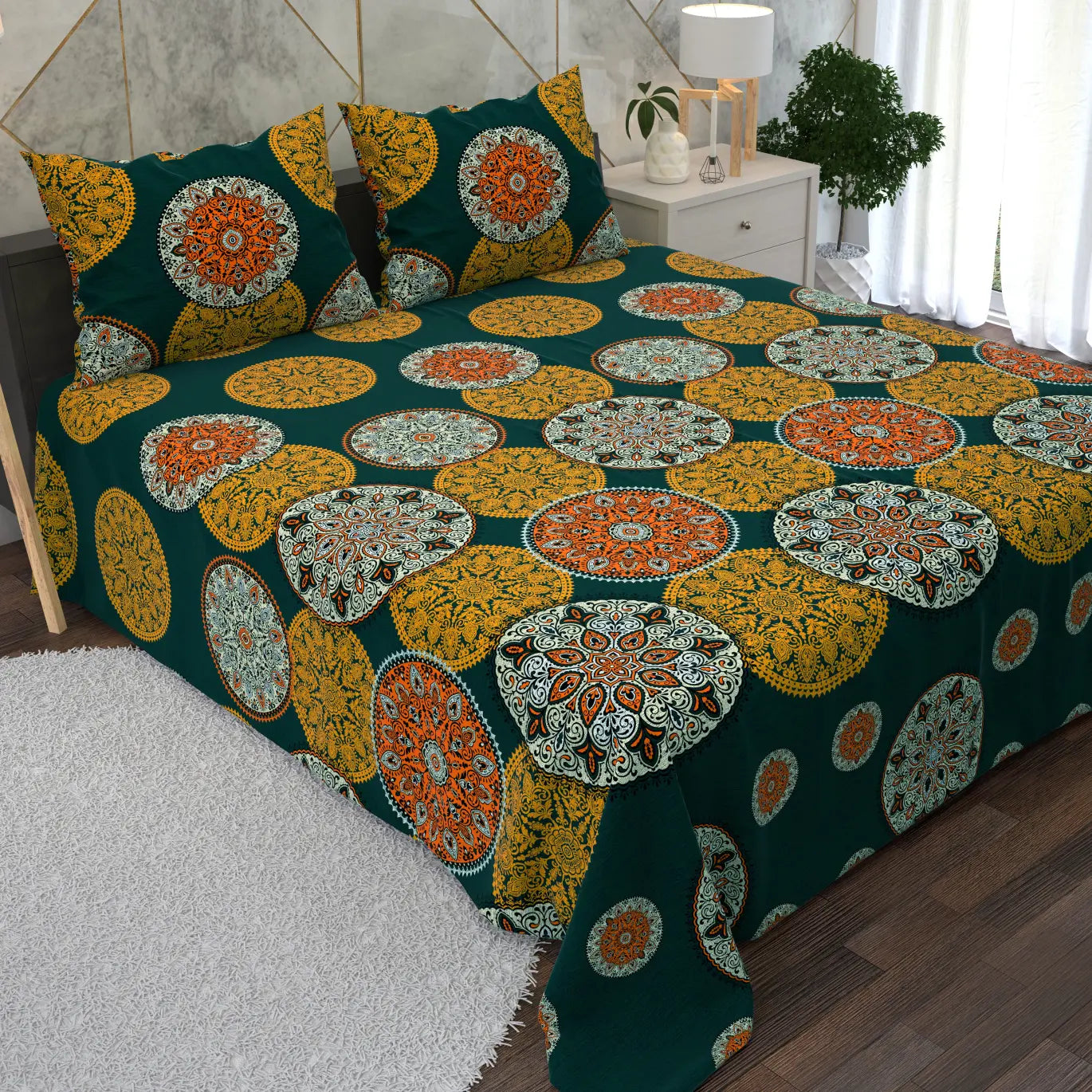 Elevate your bedroom with this 3-piece deep teal bedsheet set, featuring a striking circular medallions design. Made from soft, breathable polycotton fabric, it offers lasting comfort and durability. The rich deep teal color combined with the bold medallion pattern adds a modern, sophisticated touch to any room. Easy to care for and perfect for year-round use, this bedsheet set is the ideal choice for those seeking both style and comfort in their bedding.